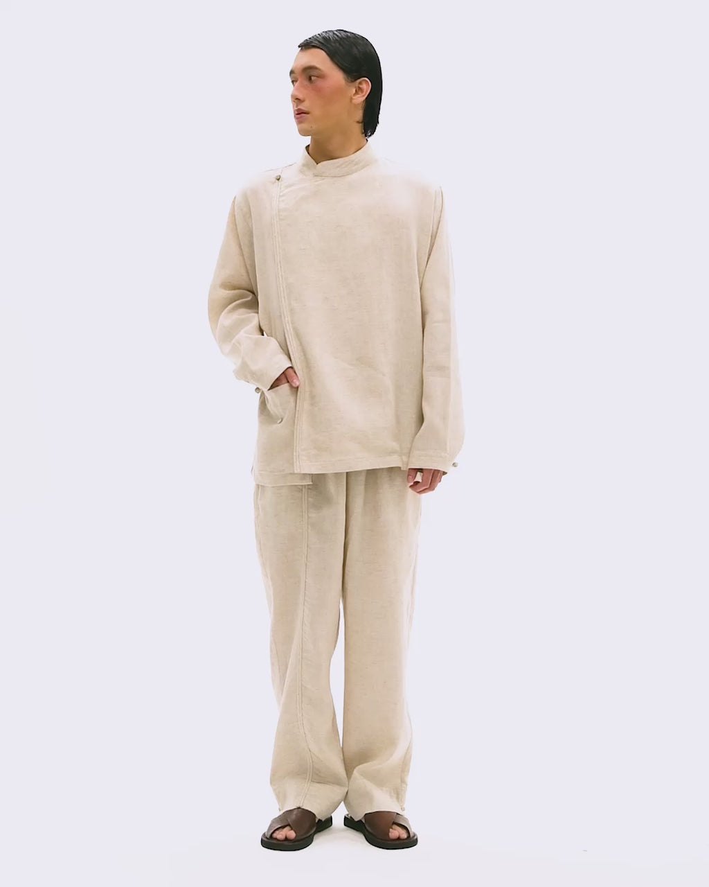 The Pulut Tang Suit brings together the warmth of heritage and the quiet ease of ISI-ISI. Inspired by traditional Tang-style garments, the piece features a mandarin collar and an asymmetric closure, creating a silhouette that feels both familiar and refined.