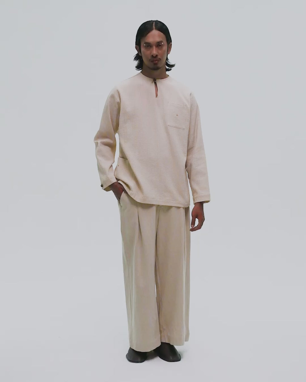 Inspired by Roti Canai; stretched, folded, flipped, and finished with intention, these wide-leg culottes translate motion into silhouette. They reflect the quiet choreography behind the everyday ritual: dough pulled wide, layered back onto itself, then given space to expand.