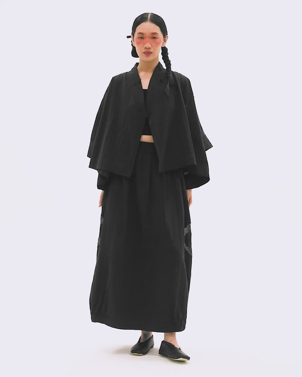 Drawing from the folded form of a fortune cookie, this kimono-like top carries a softly structured silhouette that falls with ease. Subtle detailing adds depth without excess, letting movement and texture take the lead.
