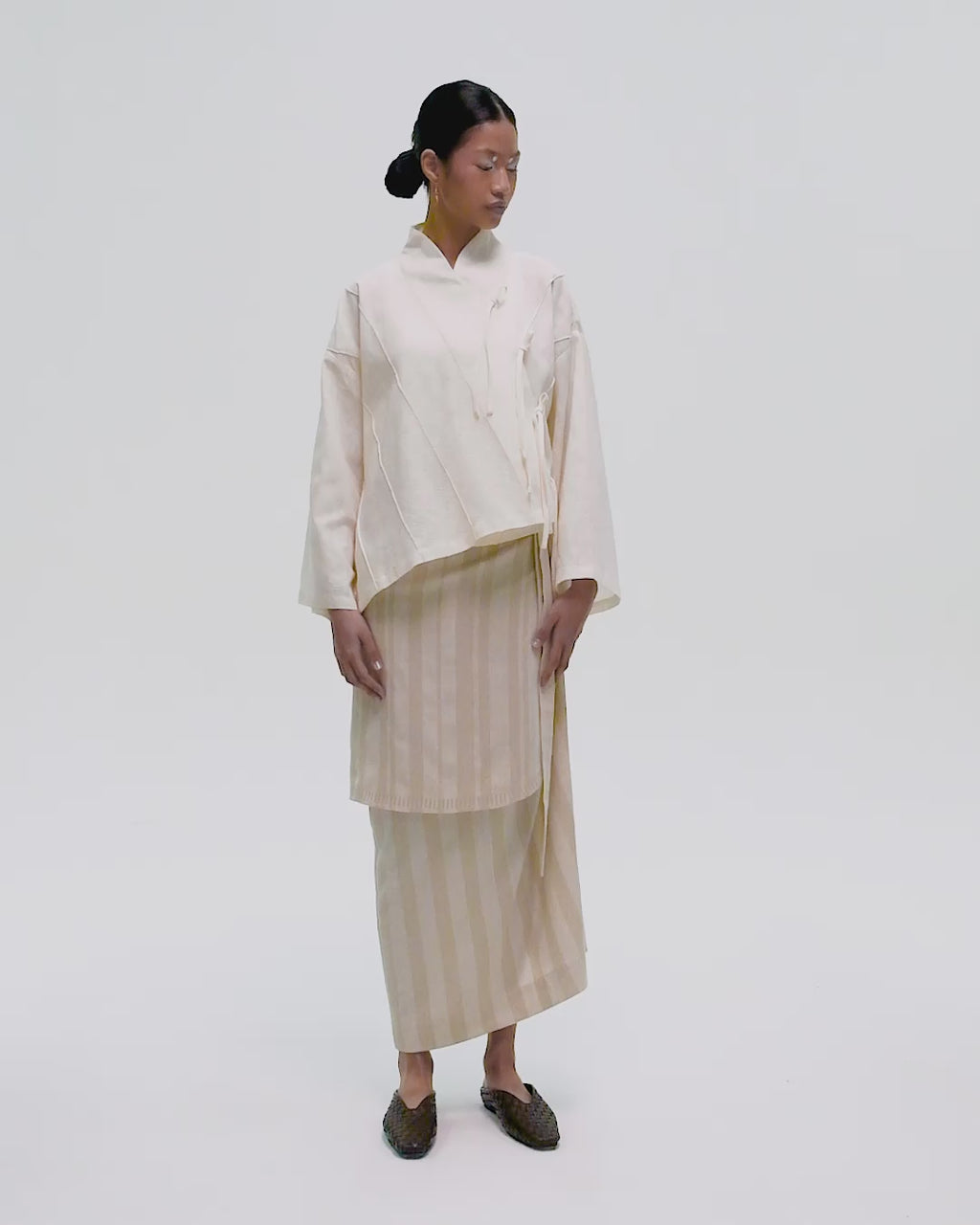 An affectionate nod to Ketupat Palas, a festive staple wrapped with care and intention, the Ketupat Palas Kebaya Janggan reinterprets tradition through soft structure and quiet detailing. Crafted in a lightweight textured fabric, the kebaya features a wrap-front silhouette inspired by the folded geometry of ketupat leaves. The overlapping panels intersect gently across the body, creating subtle angular lines that echo the woven form of Ketupat Palas, while remaining fluid and easy to wear.